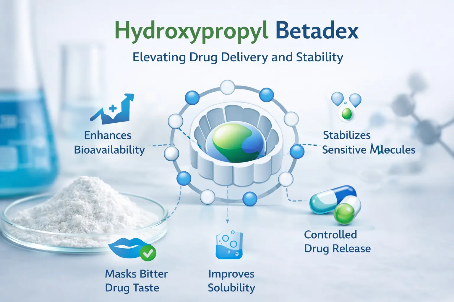 من خلال الإطلاق المتحكم فيه، يمكن لصانعي الأدوية تغيير كيفية إطلاق الأدوية دون الحاجة إلى استخدام طرق توصيل معقدة. يمكن أن يغير Hydroxypropyl Betadex كيفية تفاعل الجزيء الضيف مع الجزيء المضيف لتحقيق أنماط إطلاق فورية أو مستدامة أو مستهدفة. يؤدي هذا التنوع إلى تقليل الوقت الذي يستغرقه إنشاء أدوية جديدة ويسهل على المرضى متابعة خطط الجرعات الخاصة بهم، مما يحسن الالتزام.