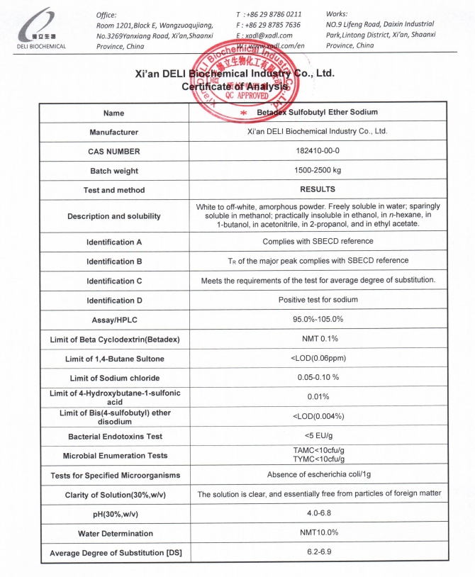 يتم تصنيع هذا النوع من الحقن Sulfobutyl Ether Beta Cyclodextrin Sodium بموجب نظام شامل لإدارة الجودة. يتم التحكم بشكل صارم في سمات الجودة الرئيسية بما في ذلك التحديد والفحص ومتوسط درجة الاستبدال والشوائب المتبقية ومستويات السموم الداخلية والحدود الميكروبية.